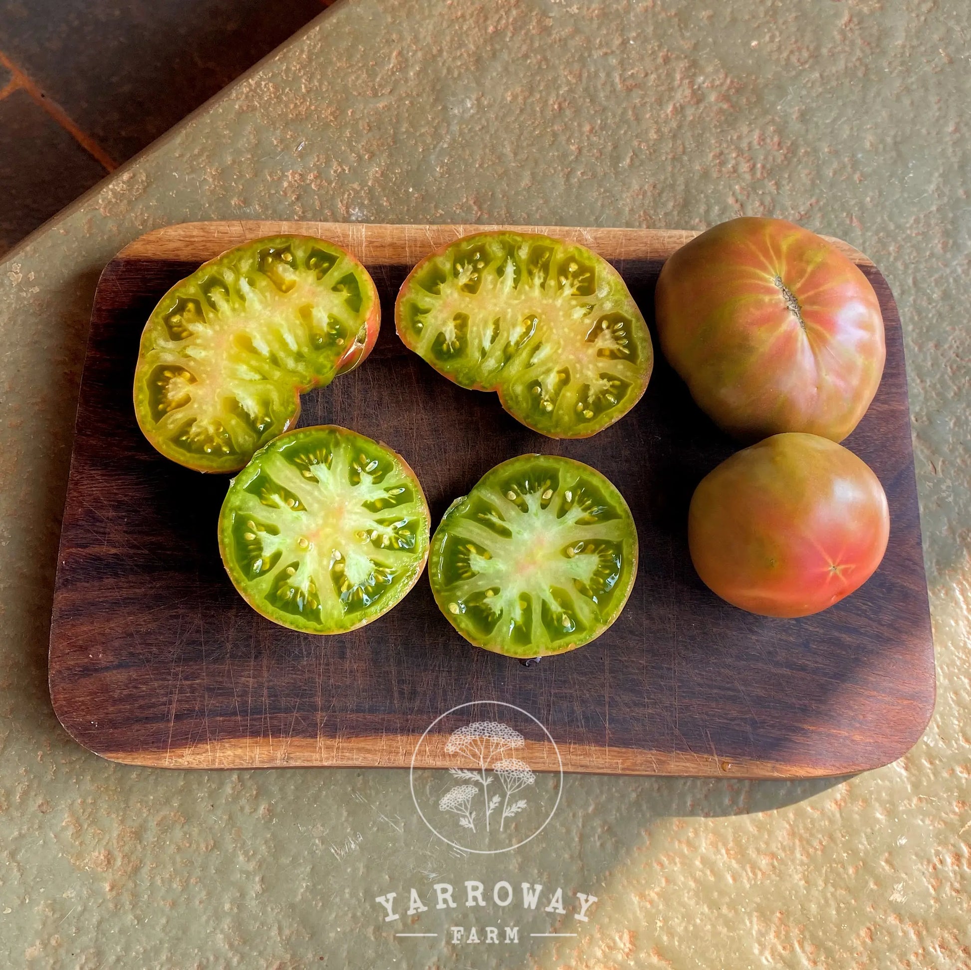 Indeterminate. Also known as black pineapple, high yielding green-purple beefsteak tomatoes that average up to 600g. Smooth fruits with a distinctive, streaked interior of pink, red, green, and yellow. They deliver a complex hearty flavor that's both sweet and rich, with smoky and acidic undertones.