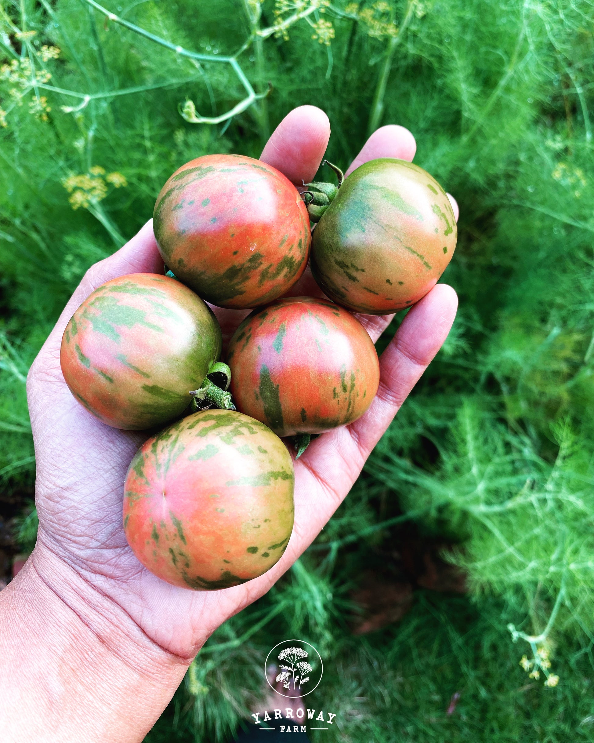 Indeterminate. Ukrainian heirloom with striped tie dye, red and dark green skin. Crack-resistant and thick-skinned large cherry tomato. Rich, complex, slightly smoky, tart flavor. Adaptable and easy to grow in extreme heat and monsoon conditions. Very productive over a long season.
