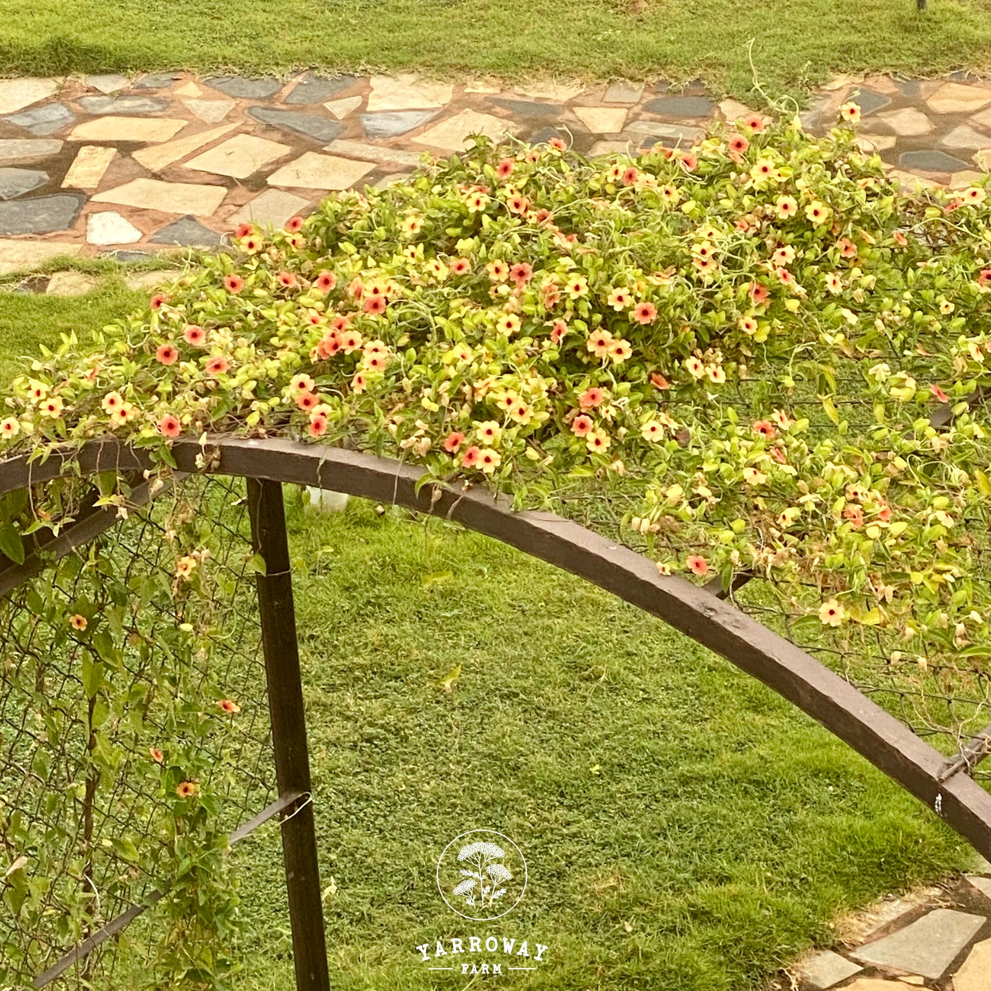 Showy 1.5" tubular flowers in shades of apricot, peach, pink, salmon, and dark centers. A sun-loving, heavy blooming vine that needs support of a fence, trellis, lattice or netting for its vigorously growing 4-5' vines. Annual in temperate zones, perennial habit in tropical climates.