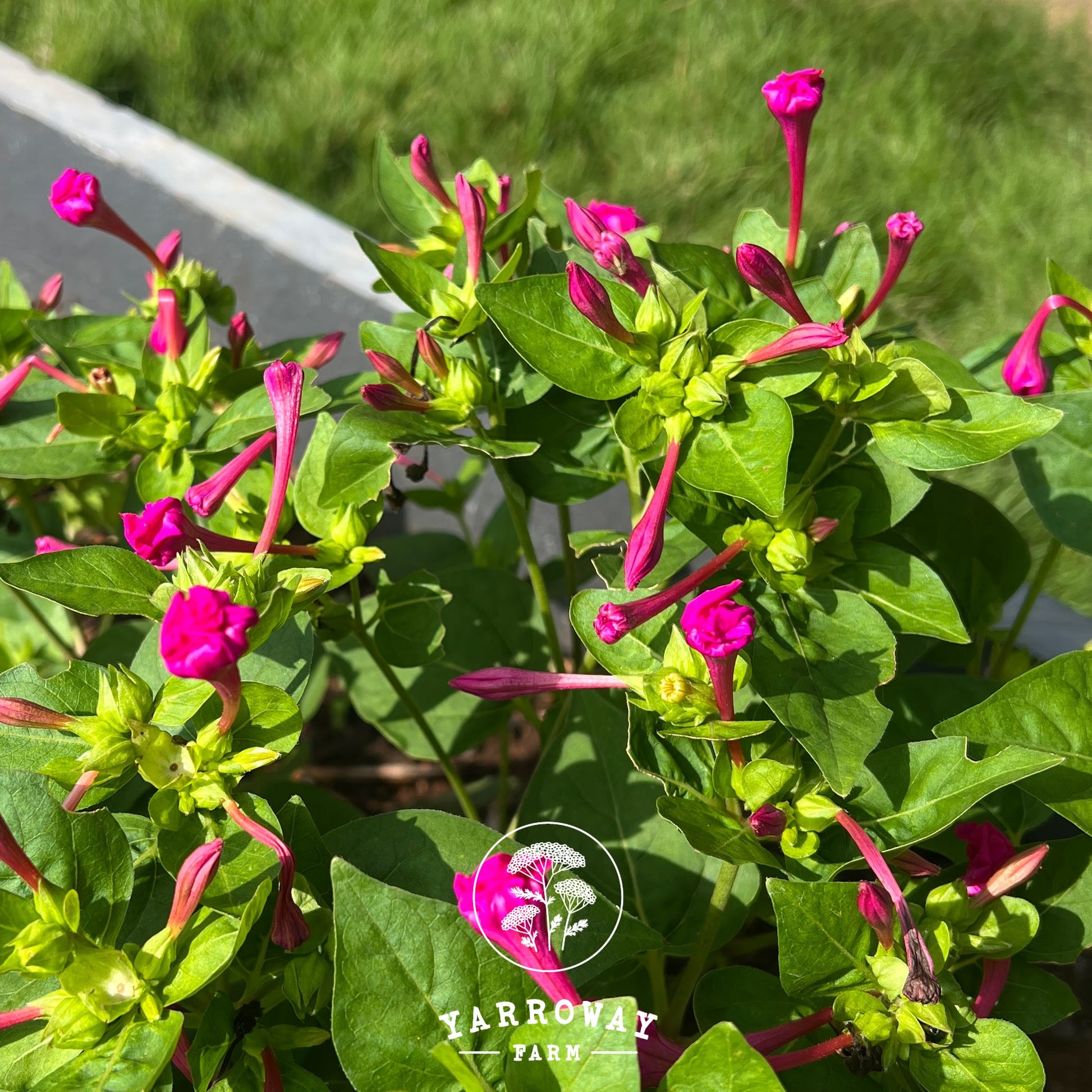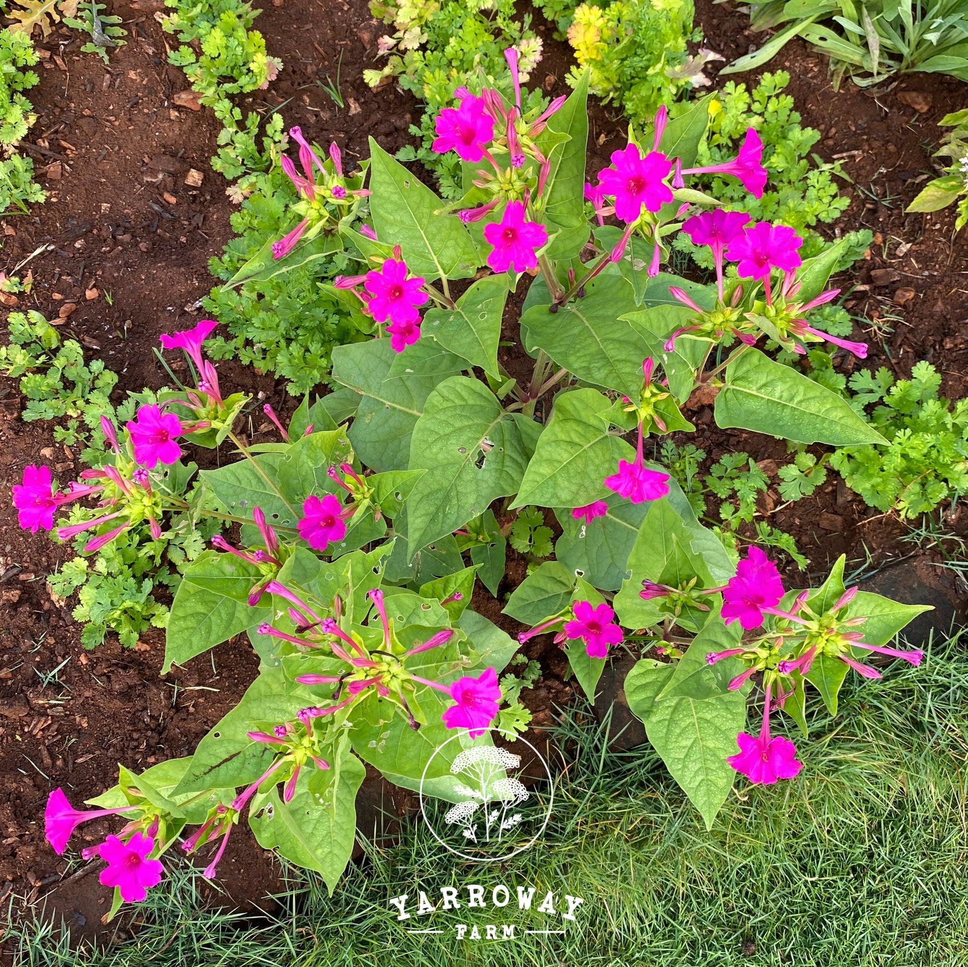 Also called 4'0'clocks. Bushy tender perennial that can grow up to 3' tall. Stunning bright pink trumpet-shaped flowers open in the evening and stay open until the following morning. They flower the first year and form tubers that help them regrow, so find them a permanent spot.