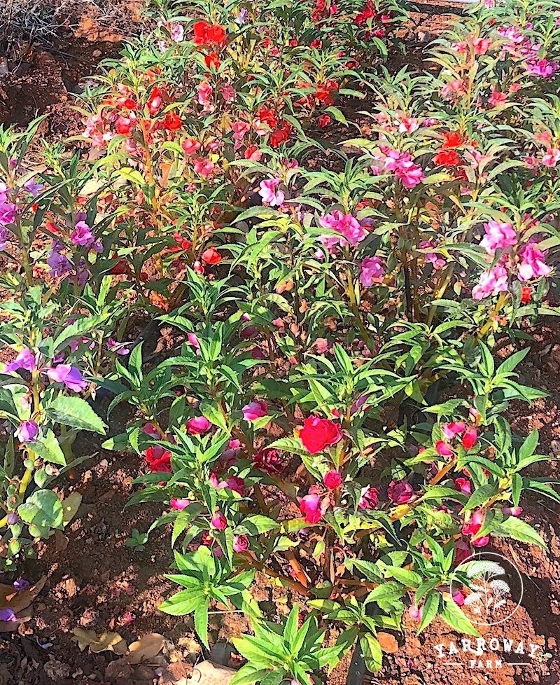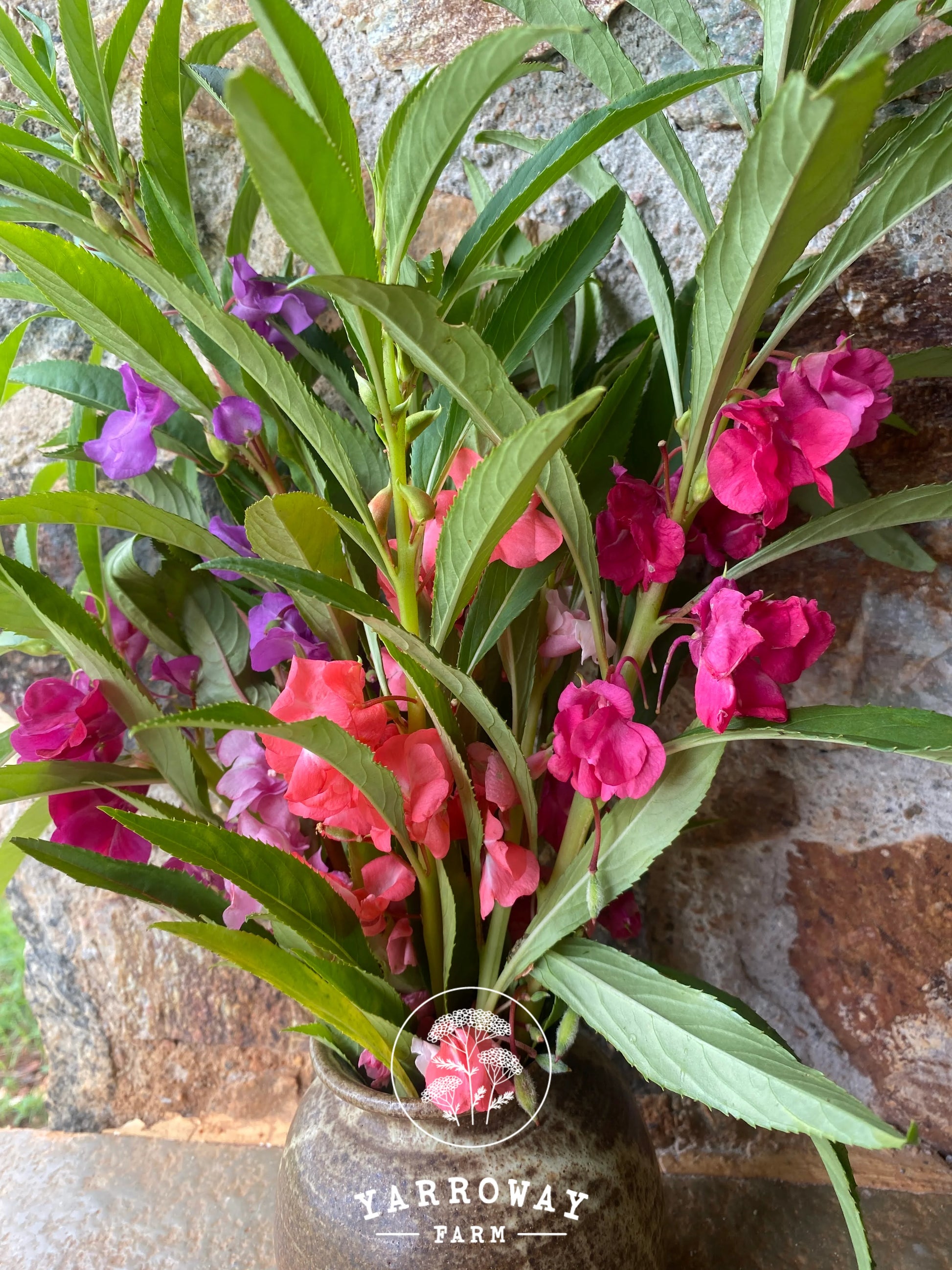 Impatiens balsamina. Also known as garden balsam. An old classic heirloom which flowers in rich and varied colors of white, apple-blossom pink, red, salmon and violet. A medium-tall annual that blooms for a long period of time. Tolerant of humid heat, easy to grow and transplant at mature stage too.