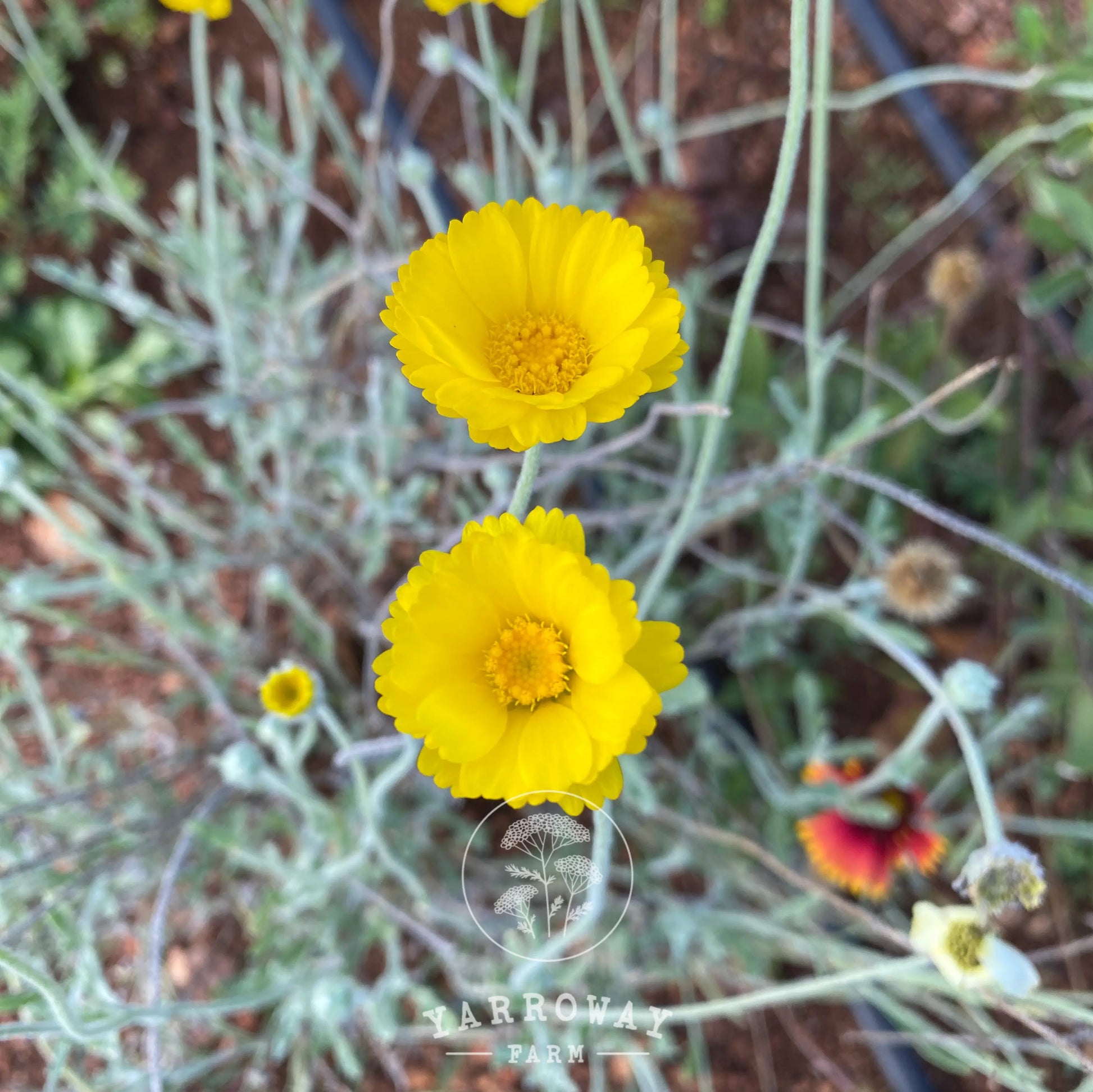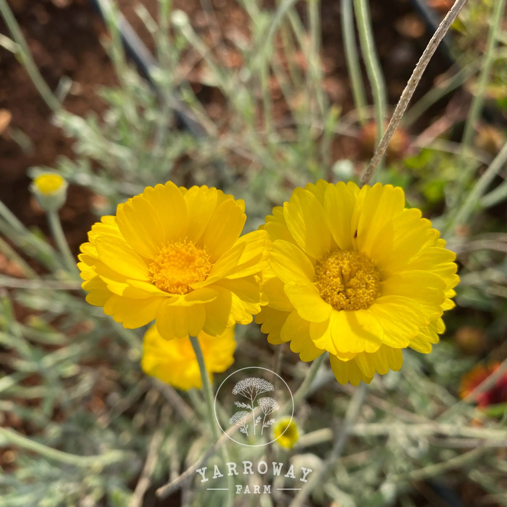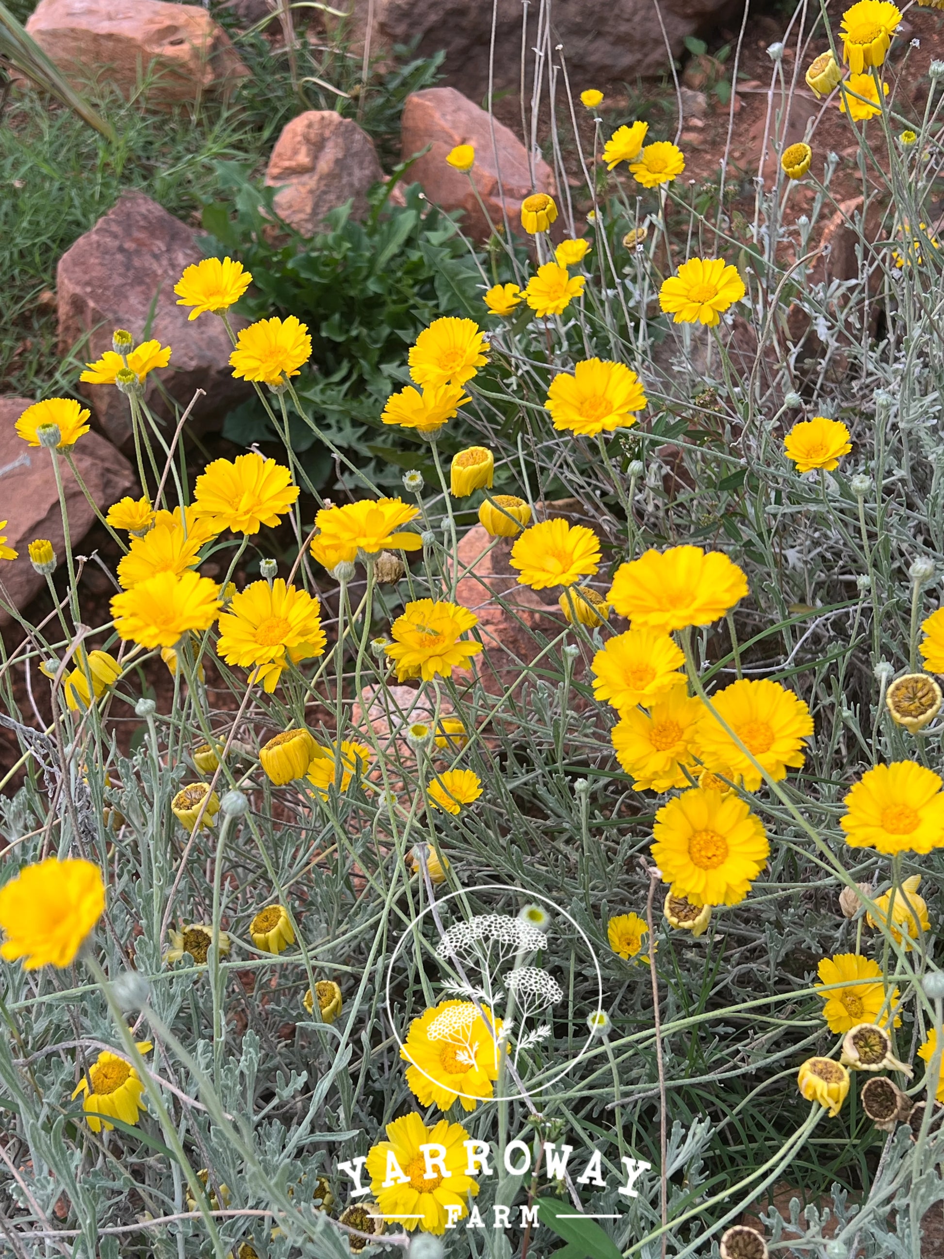 A hardy perennial, native to the southwest deserts of Americas. Though the foliage is attractive enough to stand on its own, the brilliant little yellow flowers bloom intermittently, all season. Prefers a well-drained site like a rock garden, and thrives in direct sun and heat.