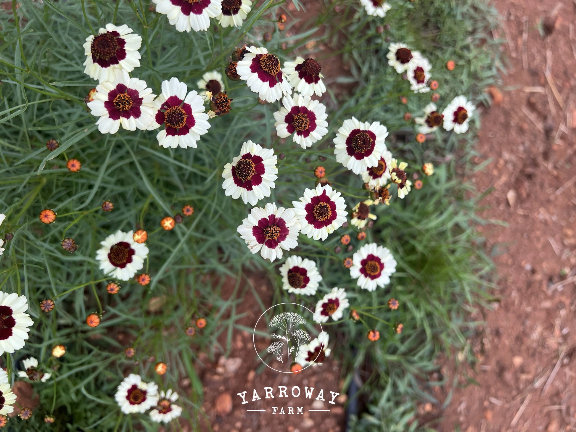 Colorful swirly blooms that are small but mighty, just 1" across, but the maroon petals dipped in lemon cream make them pop, floating atop long, wiry and bushy stems. They make stunning flower arrangements. Quick and easy grower that is heat-tolerant, and draws an abundance of butterflies and bees.