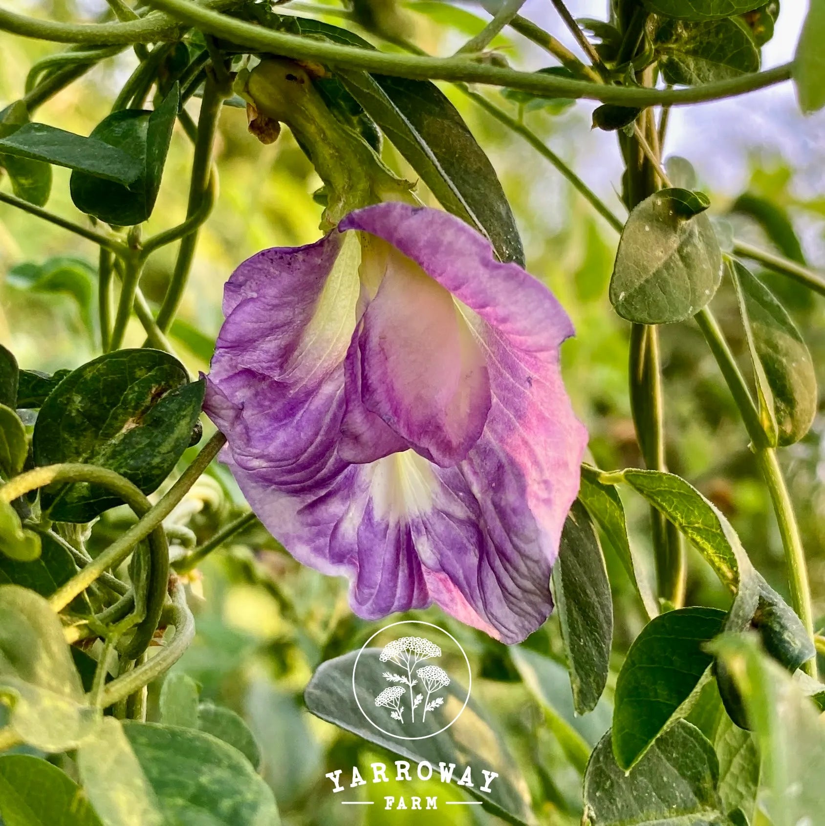Delicate single lavender-hued blooms that resemble fluttering butterfly wings. Against a backdrop of lush green leaves, these exquisite flowers create a serene and captivating display. Same culinary and herbal uses as the dominant blue variant. Thrives in well-draining soil and partial to full sun.