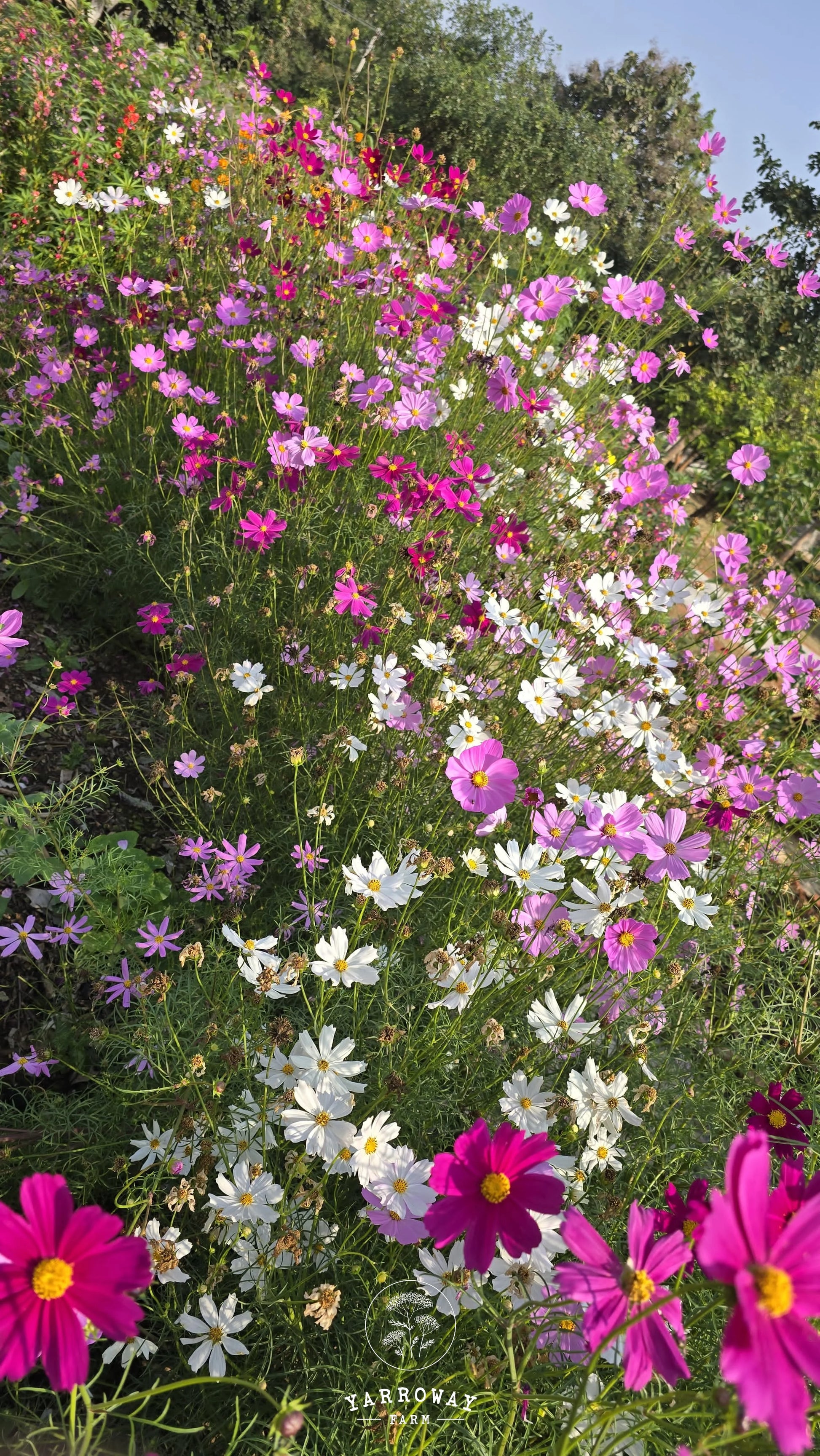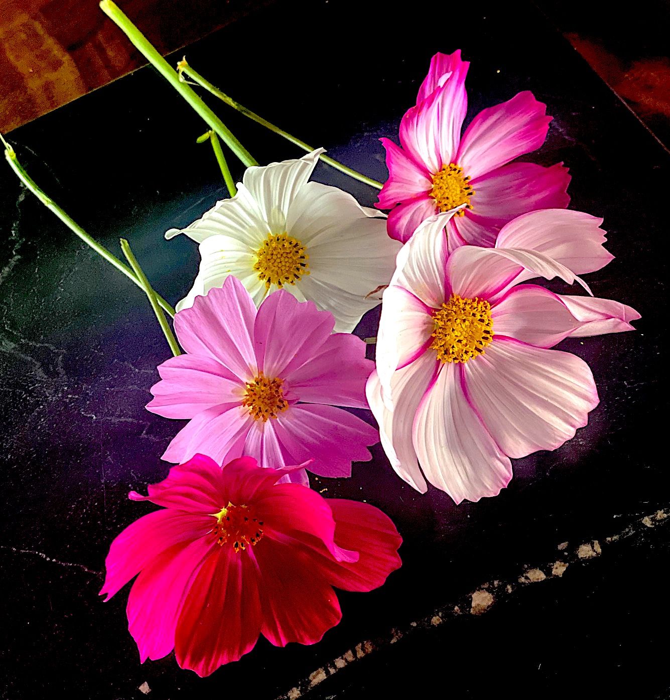 Cosmos bipinnatus. Brilliant mix of white, pink and magenta blooms. Make a bold, beautiful splash in your flower garden with a florific celebration of multi-toned blooms. Daisy-like flowers with yellow centers are magic in the border, or as cut flowers. Easy to grow plants tolerate poor soil and heat.
