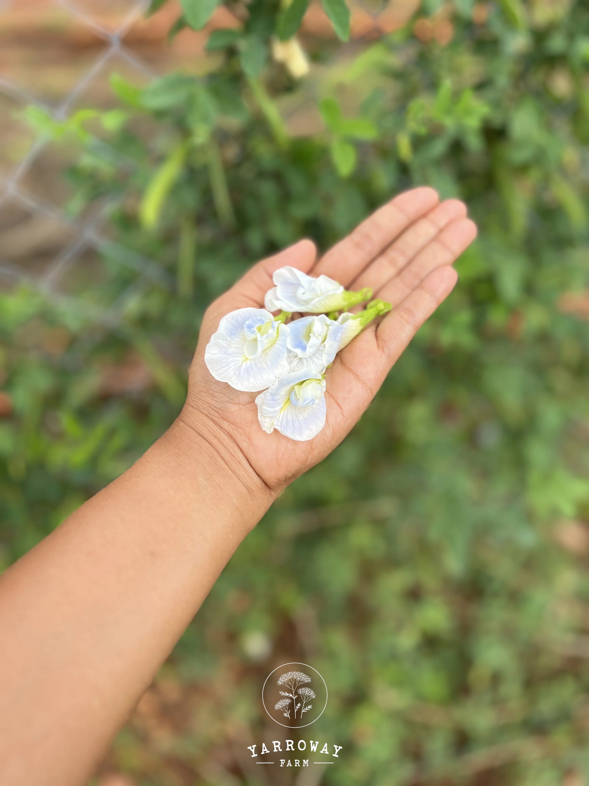 Also known as Aparajita in India. Rare and serene shade of sky blue. The climbing vines will reach 3-6', and will produce a wall of powder blue double blooms that are embellished on the vine like ornaments. The blooms are edible, and make a calming tea. Requires 6-12 hours of sun.