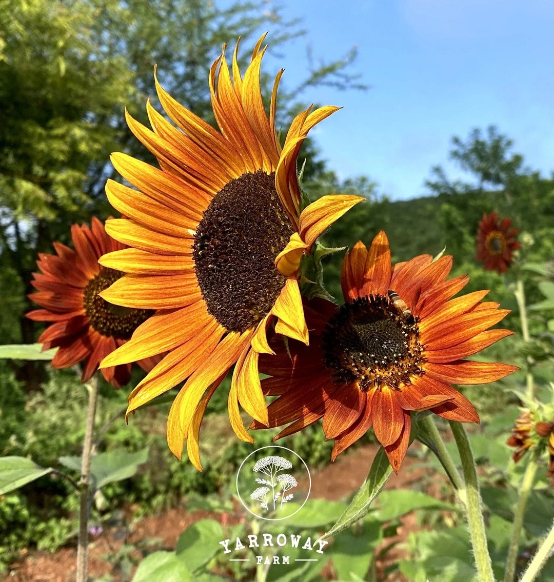 Red Sun is a branching variety of Sunflower, with long bloom-time displays in the garden and the vase. A variety of blooms from straight yellow to all red, streaked red and yellow and red with a deep corona, and also chocolate! Tall, strong plants reach 5–8' tall with multiple stems and flowers.